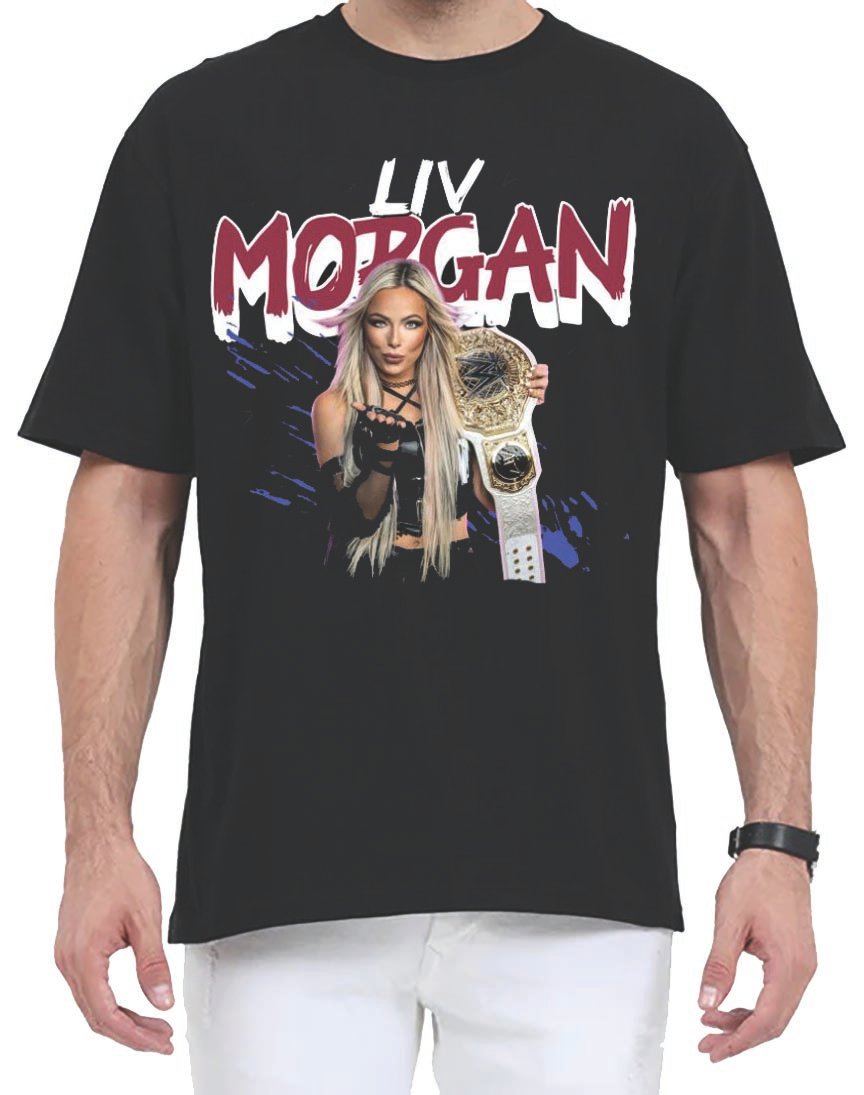 statement outfit, casual wear, premium print, pop culture apparel, trendy oversized tee, wrestler t-shirt, stylish street look, fan merchandise, unique design, wrestling culture, bold attitude, sporty vibe, Liv Morgan, WWE Superstar, Liv Morgan merch, Rebel theme, Harley vibe, badass style, streetwear fashion, oversized fit, soft cotton,