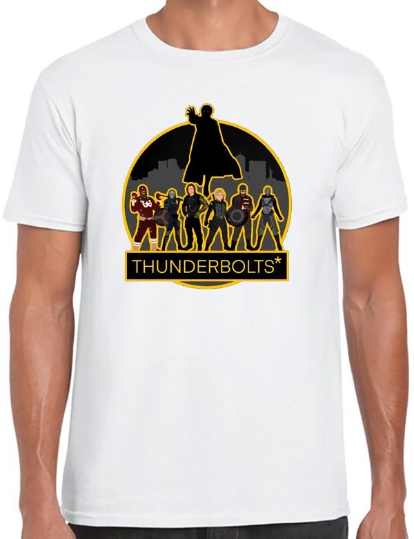 merch, Action, Jake Schreier, American superhero film, Florence Pugh, Lewis Pullman, Geraldine Viswanathan, Olga Kurylenko, Wyatt Russell, David Harbour, Sebastian Stan, Wendell Pierce,Thunderbolts*, Thunderbolts t-shirt,